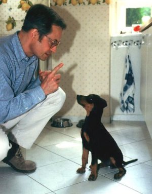 Wie sind wir an den Deutschen Pinscher gekommen?                                     Eigentlich per Zufall über nebenstehendes Foto in einer Zeitschrift. da sah ich  diesen Hund der abgesehen von der Größe meinem letzten treuen Begleiter Max   ein Doberman Pinscher verblüffend ähnlich sah. Nach genauerem durchlesen stellte sich heraus, das es sich hier um den Deutschen Pinscher handelt. Nun war    in mir ein tiefes Interesse geweckt diese Rasse näher kennen zu lernen. Ich begann via Internet bundesweit zu recherchieren und hielt Ausschau nach seriösen Züchtern. Als wir dann bei Familie Hesse aus Hasenfeld in der Eifel den ersten Deutschen Pinscher Namens Nicolo in ganzer Größe kennenlernen durften, war für uns beide klar, diese Rasse muß es sein. Nach gezielten mehreren Züchtertreffen und Gesprächen hat es uns doch schließlich zum Robinienhof von Siegfried Menzel aus Werther verschlagen. Wir haben die Familie Menzel im November 2003 Privat kennengelernt. Noch nie habe ich zwei solch engagierte Menschen getroffen, die sich für den Erhalt dieser fast ausgestorbenen Rasse (Stand 2003) einsetzen. Damit dies nie geschieht werde ich als 2.Vorsitzender im PSK der OG Aachen auch meinen Beitrag dazu leisten. Sollten sie sich für einen Deutschen Pinscher vom Robinienhof entscheiden, dann nehmen sie sich Zeit mit, sie werden es nicht bereuen. Wir sind von dieser reinen Rasse mit seiner Intelligenz, Aufmerksamkeit, ruhende Ausstrahlung, Energie und Spielfreudigkeit begeistert. An dieser Stelle  kann ich nur jeden Hundefreund zu einem Deutschen Pinscher raten. Aufgrund meiner persönlichen Hundeerfahrung (Florian ist unser dritter Hund) würde ich auch gerne anderen Pinscher Besitzer oder auch künftige meine Erfahrung bzw. Hilfestellung geben.